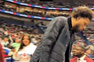 CC在球迷的MVP欢呼声中帅气入场,被绊了一下,对拍摄的球迷说:这段你最好给剪掉😂