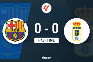 上半场比赛结束,巴塞罗那0-0皇家奥维耶多。
