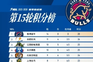 NBL常规赛第15轮战罢,香港金牛在少赛一场的情况下,凭借14连胜的战绩,积28分继续位列积分榜首位,也仍是联盟唯一保持不败的球队。